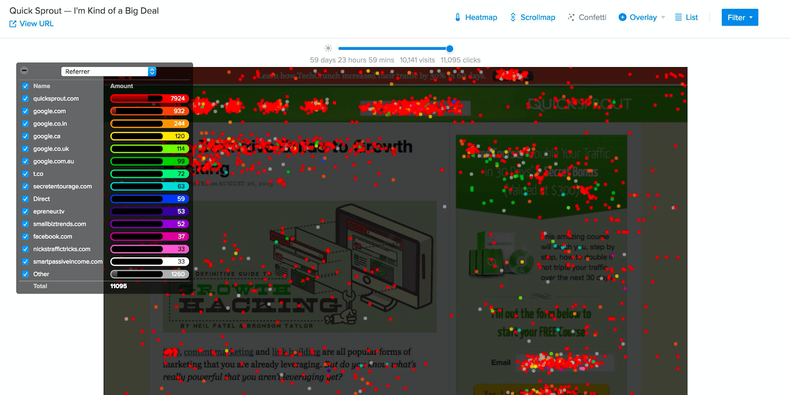 Le rapport Confetti, par exemple, filtre les clics selon la source d’acquisition. Chaque rapport permet de voir où les visiteurs interagissent sur une page donnée, et d’analyser les comportements selon différents segments d’utilisateurs. Vous pouvez ainsi comprendre :